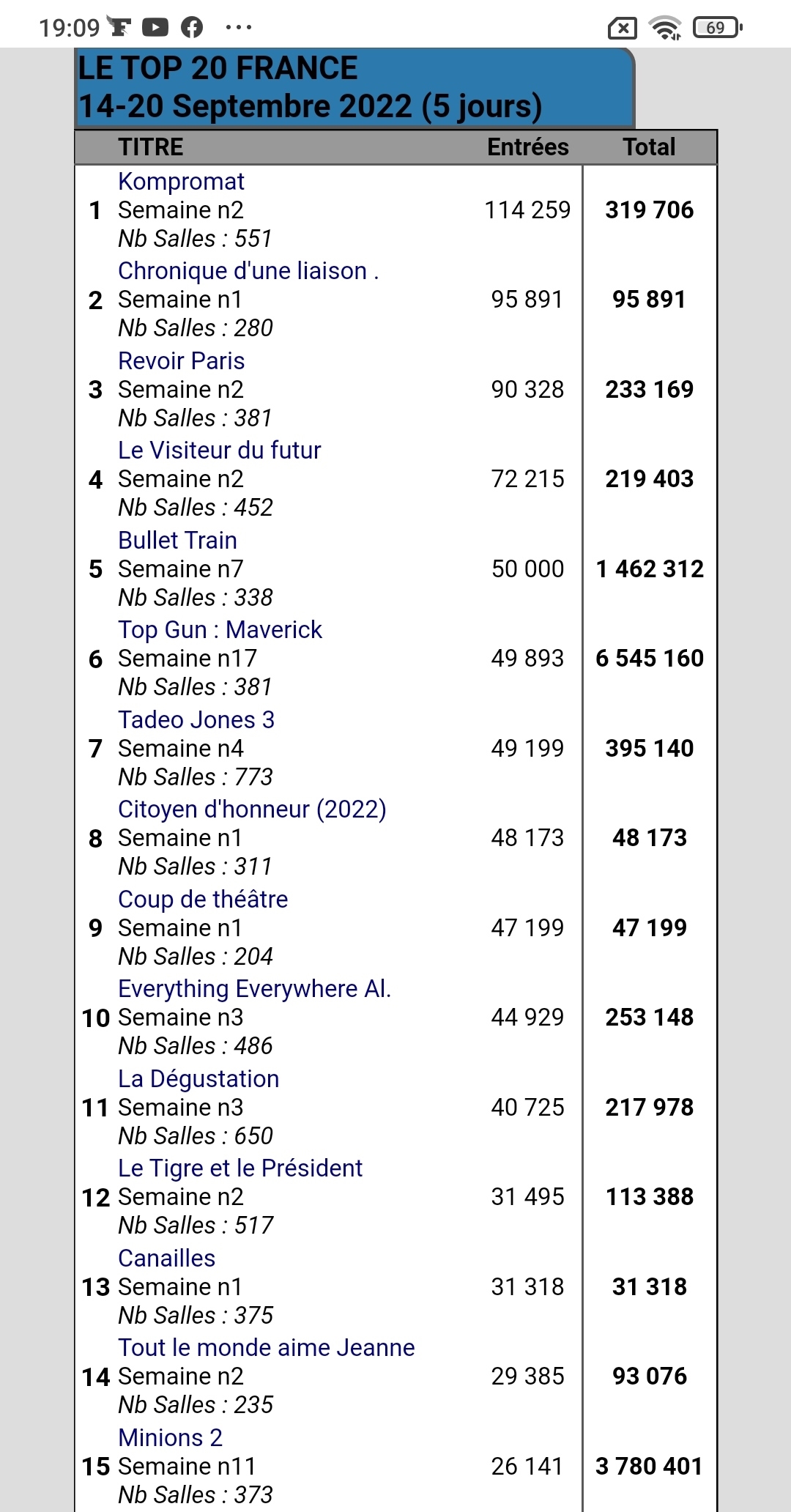 Ragounet a écrit : lun. 19 sept. 2022 19:11 Revenons aux chiffres avec le top 15 France 5 jours. Faute de locomotive, c'est vraiment poussif.