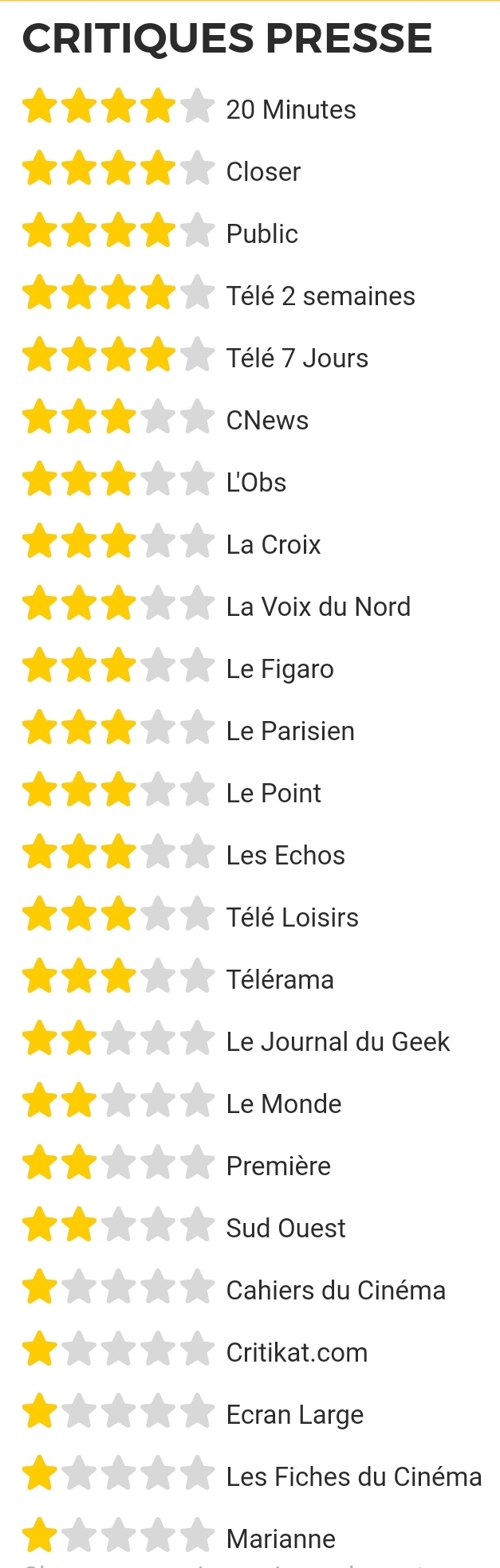 Les critique presses commence à sortir et ça fait mal. Le monde assassine, Ecran large aussi, ciné série aussi, Première est plus sympa. Et toutes les critiques disent la même chose où sont passé les 65 millions d'euros ? Facile dans les salaires des acteurs et cameo. Rien pour les SFX, décor, costumes alorsque c'est là que doit être d'abord le budget.