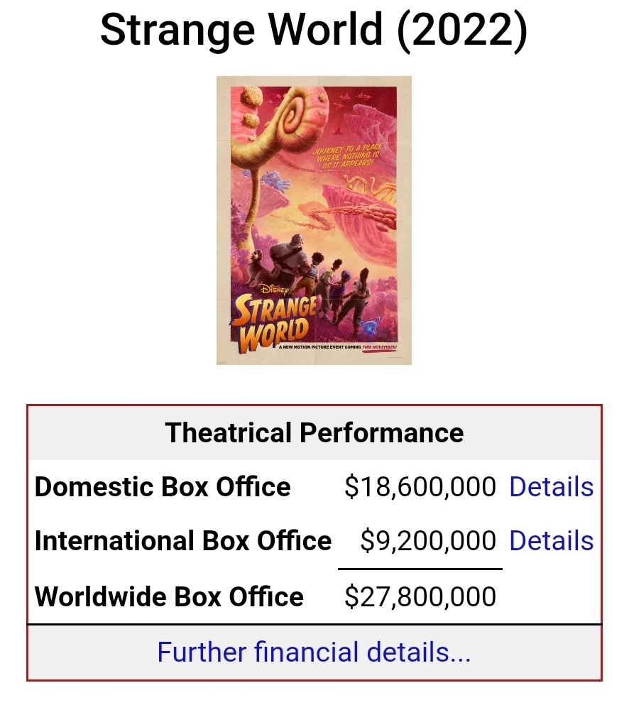 147 M$, c'est le montant que devrait perdre Disney avec l'exploitation salles de Strange World (Avalonia en VF) ! (Variety)