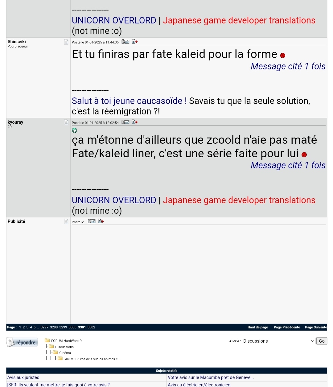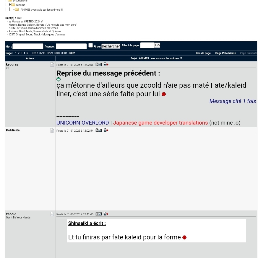 j'ai une chouette idée pour le fofo mais je sais pas si techniquement, elle est faisable : Il s'agirait de reprendre le dernier post/message d'une page au début de la page suivante. Ainsi, il y aurait une continuité dans la discussion et ça éviterait de devoir retourner à la page précédente à la lecture du premier post d'une page.